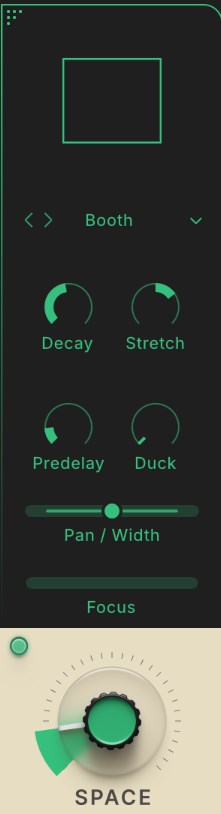 - Space(スペース):ドラムルームの生々しい残響から、ビンテージ・デジタルハードウェアのわざとらしい「ザラついた」リバーブまで、計20種類のスタイルが選べる空間モジュール。Decay(減衰)やPredelayといった基本設定だけでなく、ドラムのアタック時にリバーブを引っ込ませる「ダッキング」効果や、M/S(Mid/Side)によるステレオの広がりまでノブ一つでコントロール可能です。