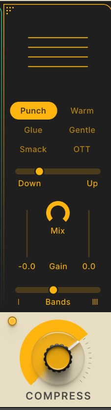 - Compress(コンプレス):ドラム専用にチューニングされた6種類のコンプレッション・アルゴリズムが用意されています。VCA系のトランジェントを際立たせる「Punch」、バス・コンプの定番であるすべてを一つにまとめる「Glue」、FET回路をシミュレートした激しい「Smack」や光学式の「Gentle」、さらにはEDMで必須とも言えるマルチバンド処理「OTT」スタイルまで網羅。