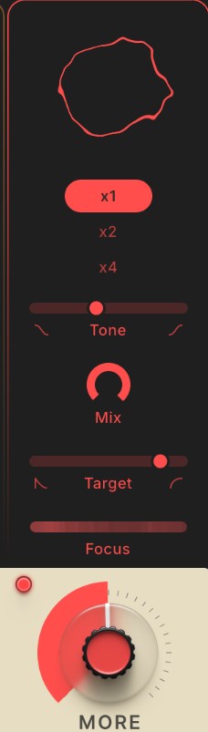 Moreはサウンドをよりアクティブにする密度とスケール感を加えるウェーブシェイパーと、ピークを抑えつつ歪ませるリミッターを組み合わせることで、マスターバスのリミッターを乱すことなく、より前面に出たサウンドを実現します。