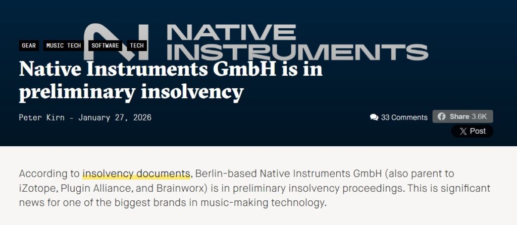 - ベルリンのNative Instruments GmbH(iZotopeやPlugin Allianceの親会社でもある)が、ドイツの法律における「予備的破産手続き(Preliminary Insolvency Proceedings)」を開始しました。