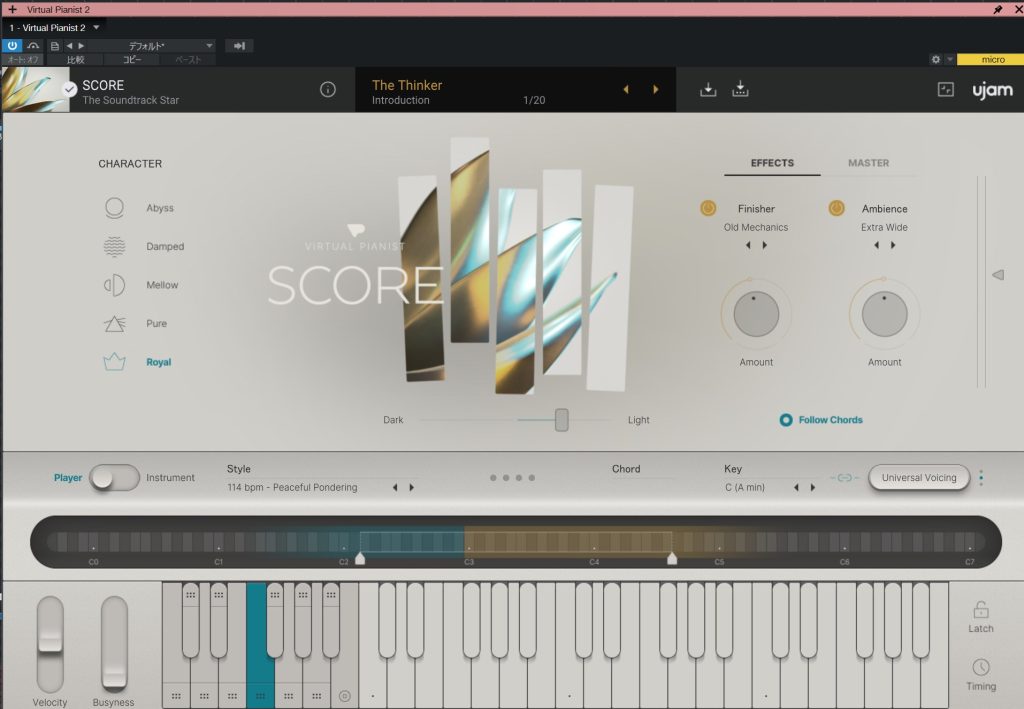 発売済みのピアノのVirtual Pianist『UJAM VOGUE』に比べると、音の力強さや音色の音抜け感は強くありません。