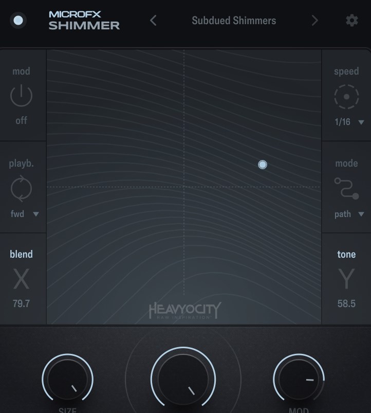 名前の通り「シマーリバーブ」で原音のピッチシフターがかかり美しいきらびやかな音色が鳴らせる特殊なエフェクトです。