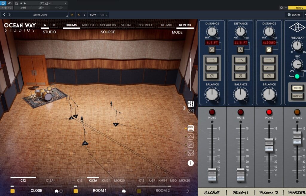 ルームマイクを再現するため、必ずリバーブがかかった音になります。