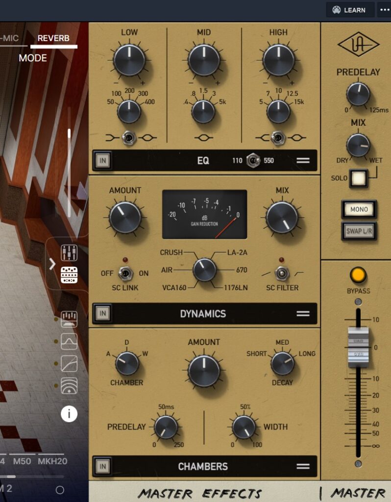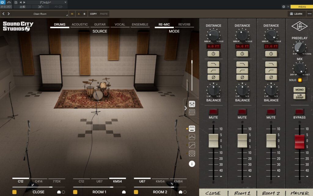 UAD Sound City Studio Pluginが実際にルームマイクで録音した状態に近いシミュレーションをしていることがわかります。