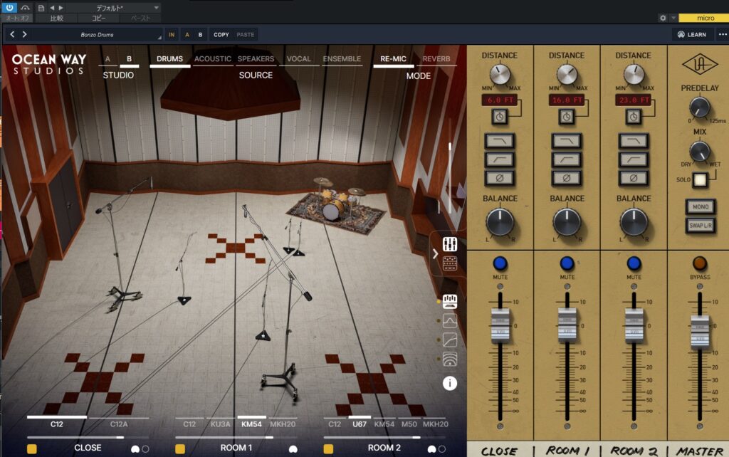 ドラムトラックならSource Drumを選んでWallかCornerのプリセットを指定。StudioA,StudioBのどちらを選ぶのか?でもかなり音が変わります。