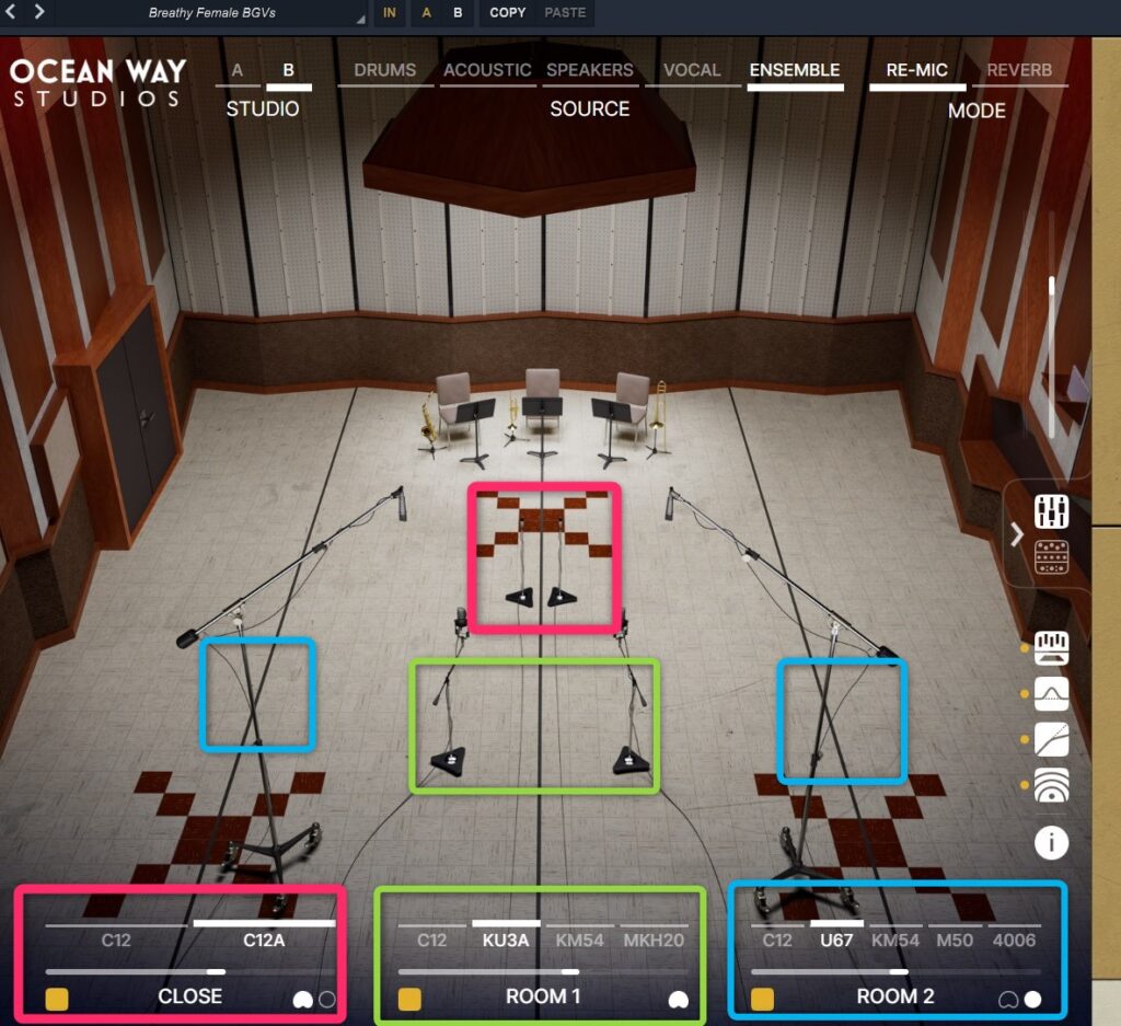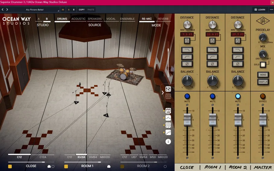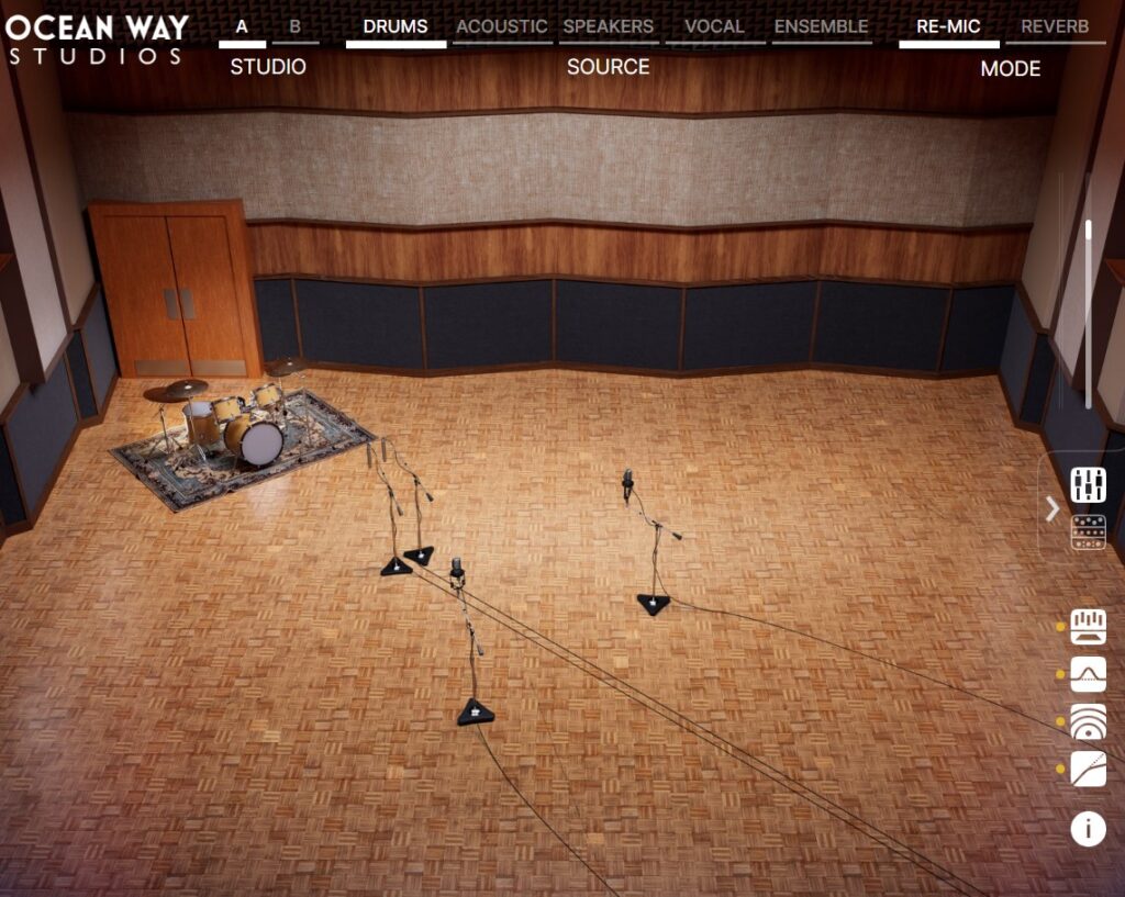 Ocean Way Studios Deluxeのスタジオ空間に完全に没入したい場合は「Re-Mic」プロセッサーとして、ドライ信号とセンドパスおよびリターンパスをミックスして使用する従来のリバーブワークフローで使用できます。