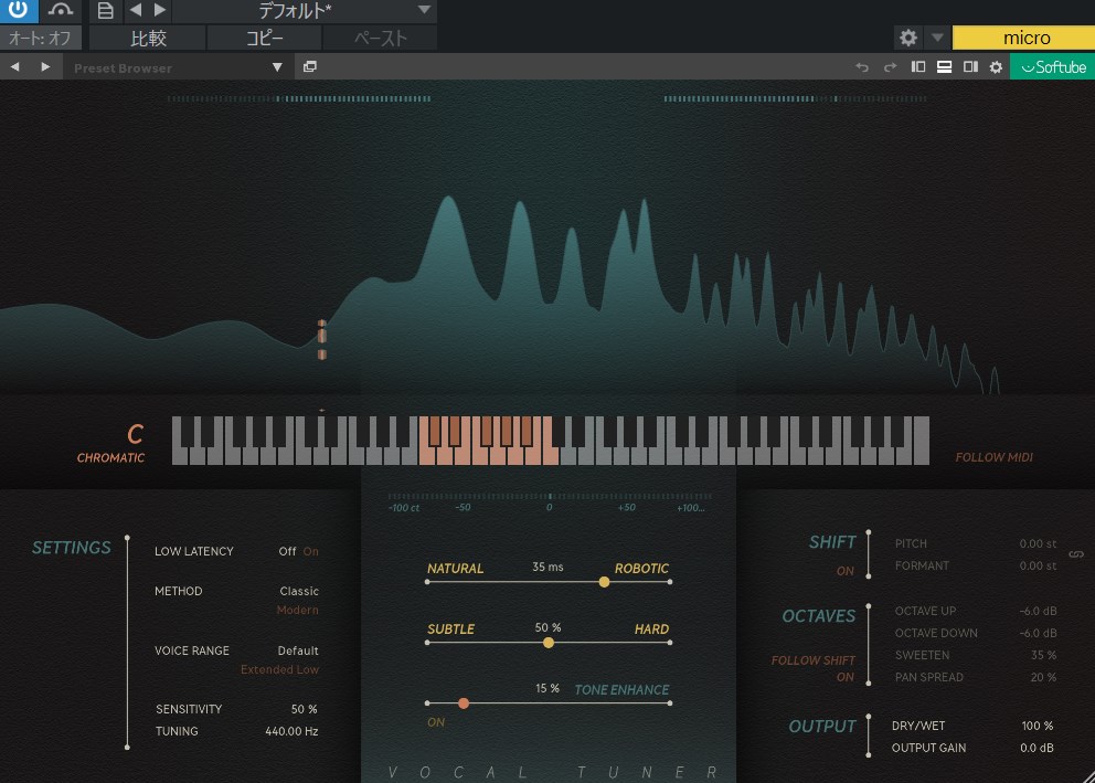 後発のSoftube VocalTuner は、UAD Top line Vocal Suiteから+αのエフェクト部分を外してリアルタイムピッチ補正に特化した内容になっていて反応の速さがピカイチ!