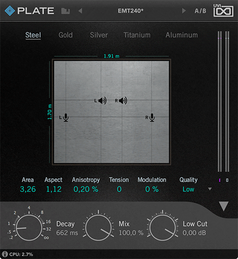 UVIのフラグシップシンセFalconで利用できる「Plateリバーブ」を単体プラグイン化したモデル。