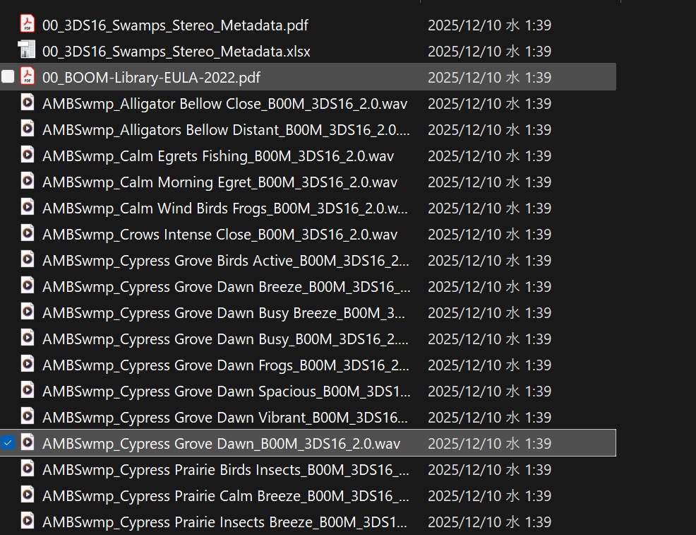 沼地でフィールド録音した音を大量に収録しています。(合計11.7GB / 72ファイル)