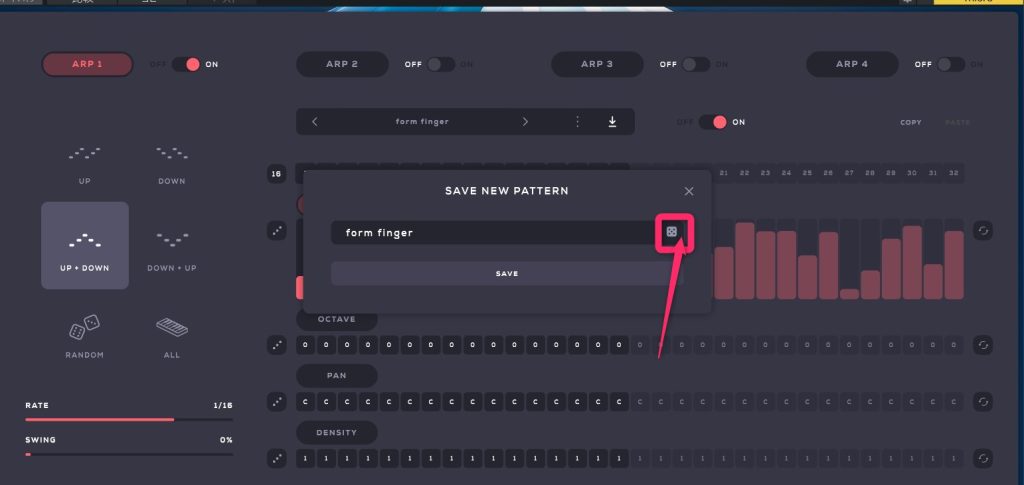 アルペジエータープリセットは用意されていませんが。気に入ったパターンを見つけたらガンガン保存していくのをおすすめします。アルペジエーターのプリセット名にもランダマイザーが用意されています。