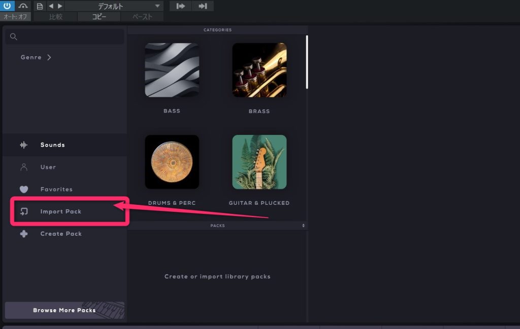 「Import Pack」のボタンを押してダウンロードした「◯◯.sbpack」(CosmoをインストールするならCosmo.sbpack)を選択します。
