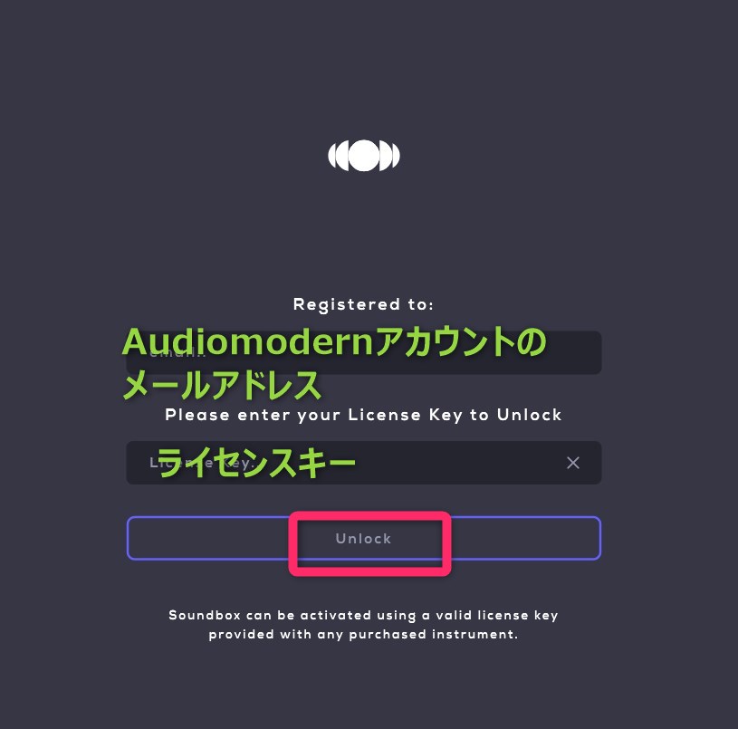 Audiomodernへ登録しているアカウントのメールアドレスと、 Soundbox Instrumentのライセンスキー(’シリアルナンバー)を入力してUnlockを押します。