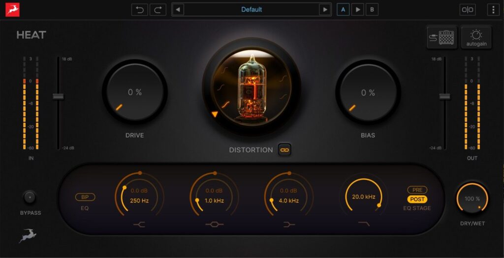 DRIVEノブを上げていくと、音は徐々に飽和し、レベルメーターは赤く張り付きそうになります。しかしHEATには優秀な「Auto Gain」機能が備わっています。