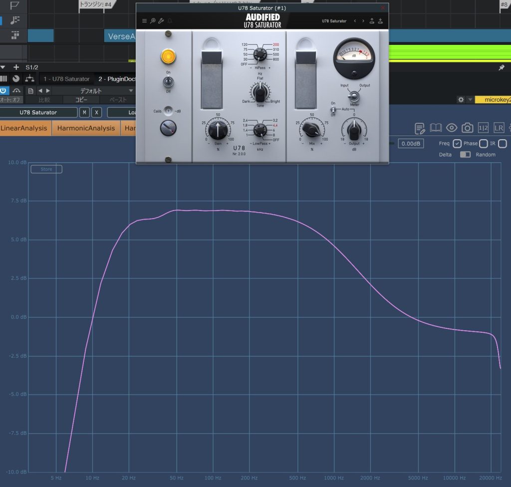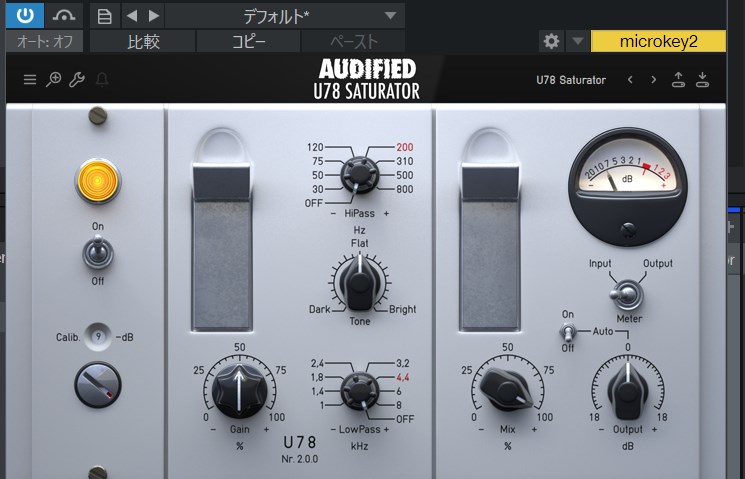 Audified U78 SaturatorをONにしてサチュレーションGainをちょっと上げるとちょうど良い心地よさを感じる太さになります。ディストーションエフェクトのような破壊的な音にはなりません。ちょっと歪んだな!という程度。