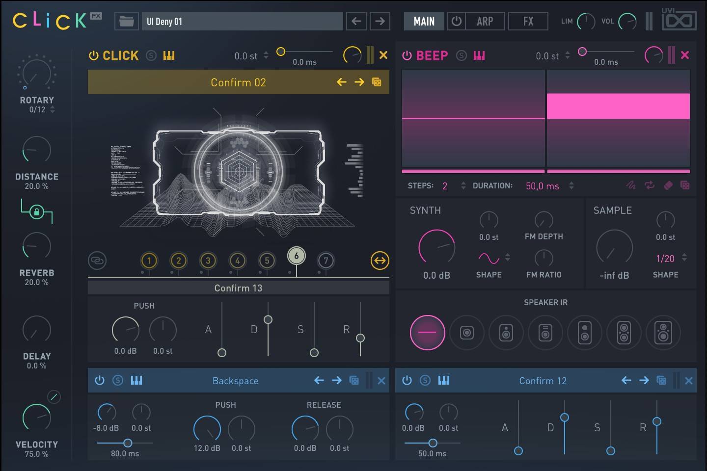 UVI Clickは31,000以上のサンプル(900層)、680のプリセット、FM合成を含むBeepモジュール、5レーンアルペジエーター、グラニュラー・ディスパーサー・コーラスを含む多彩なエフェクト、そしてユーザー独自サンプルのインポート機能で、「クリック・UI音・フォーリー・実験的デジタルサウンド」の全領域をカバーするハイブリッドサウンドデザイン音源です。