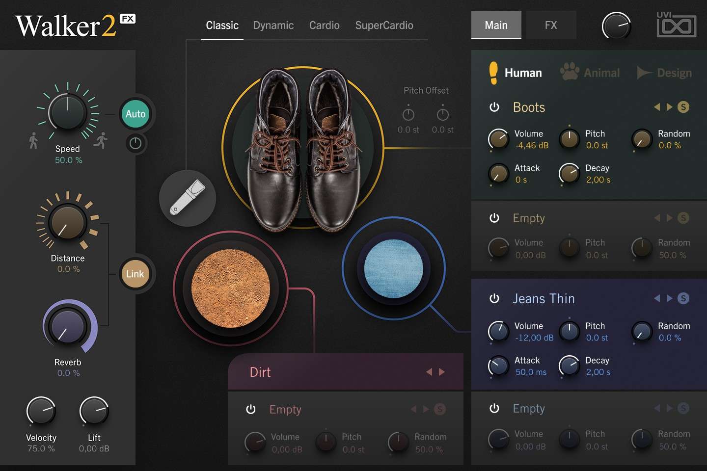UVI Walker2は、この「足音フォーリーのデザイン」に完全に特化した専用ツールです。45,000以上の新録サンプル(前作の数十倍の規模)、14種の靴、8種の動物の足(肉球・蹄・鉤爪)、ロボットやクリーチャーの足、そして32種の地面素材という圧倒的なライブラリを内包し、鍵盤を弾くだけで映像に完全にシンクロした「あらゆる歩行・疾走」をリアルタイムで設計できます。