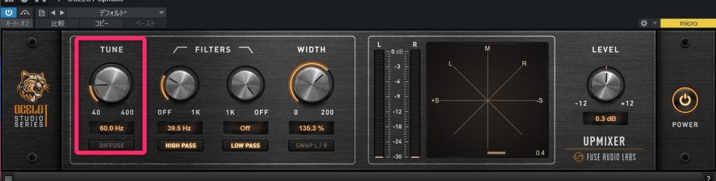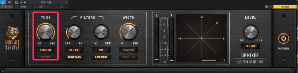Tuneはトラックの鳴っている帯域に対しての広がりの効き方を調整します。使う音に対して低い音の場合はTUNEを下げ、高い音の場合はTUNEをあげるとうまくいきます。