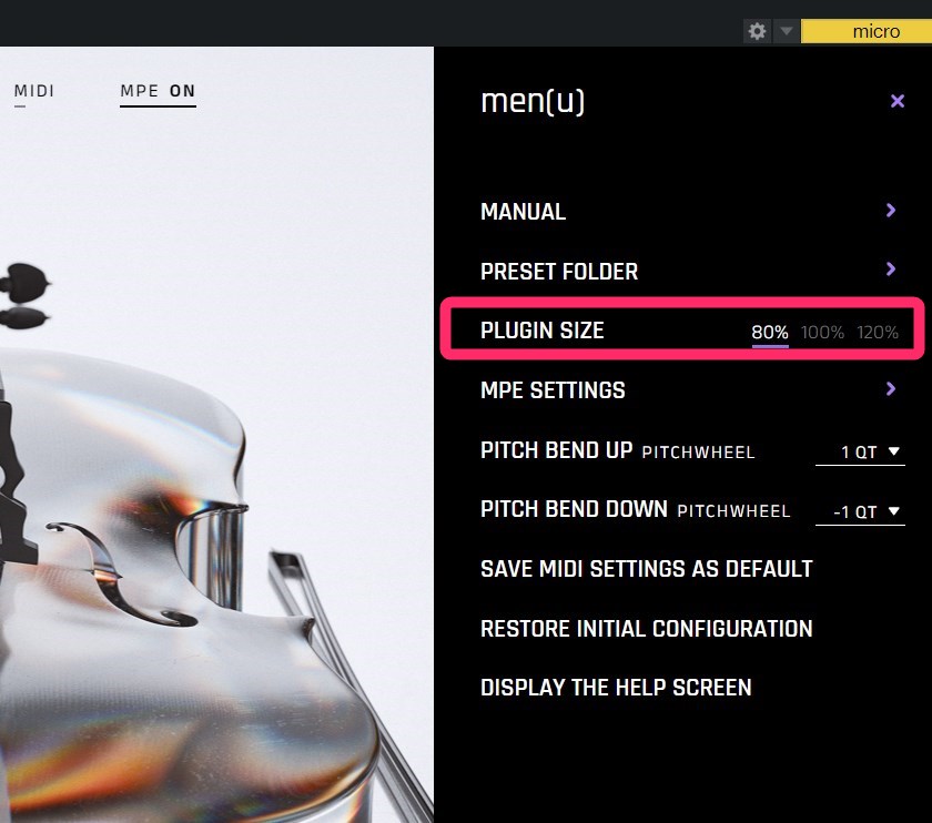 Menuの「PLUGIN SIZE」より80,100,120%から選択します。