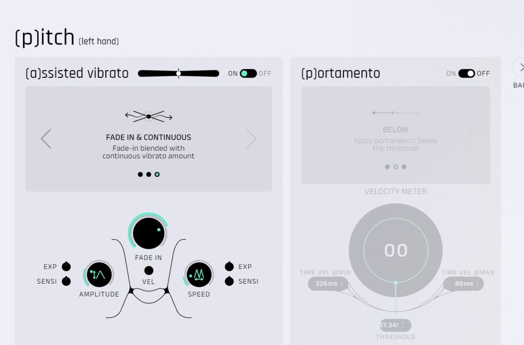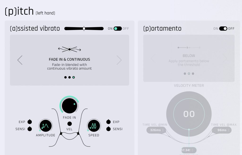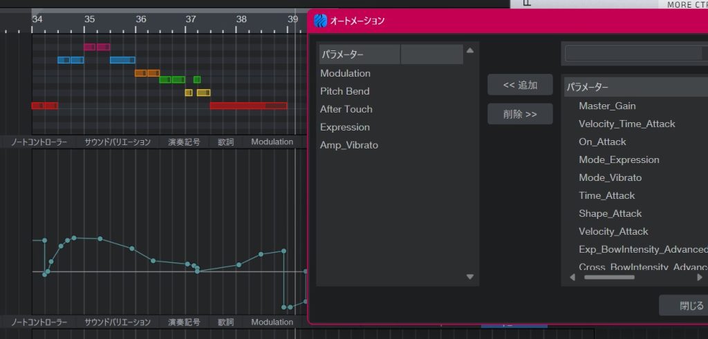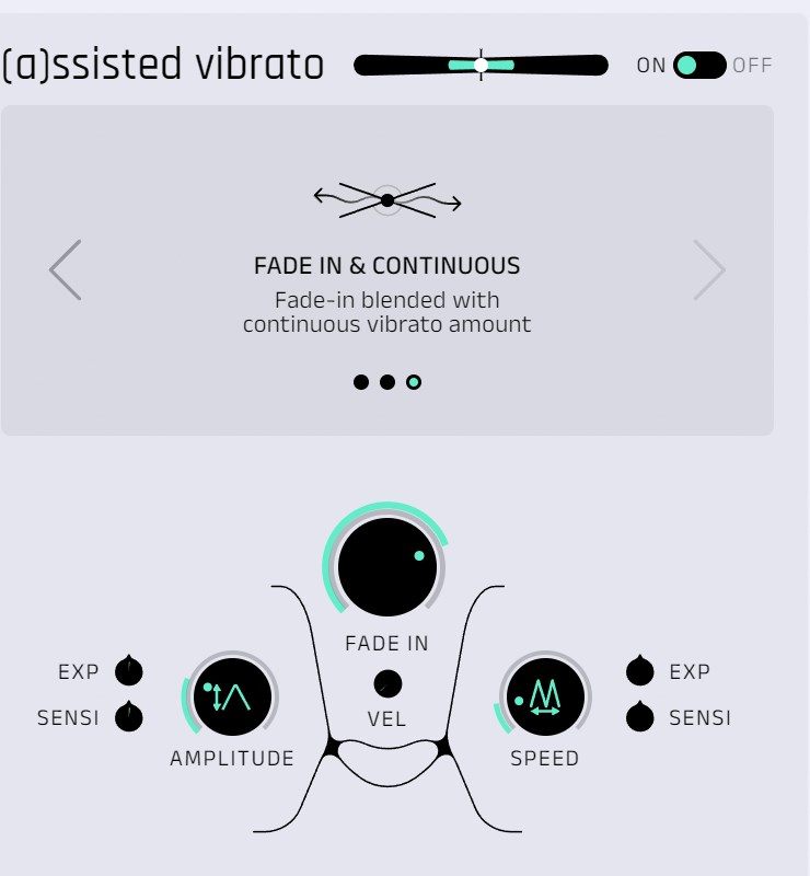 サンプルベースのストリングス音源だと、ビブラートの幅はそのとき収録されたビブラート幅で固定になるわけですが、物理モデル音源のため、ビブラートの揺れ幅を自在にコントロールでき人が演奏しているように鳴らすことが可能です。