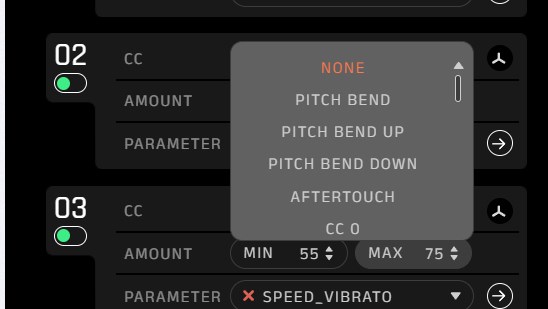 固定値だとビブラートのかかりが極端になることが多いです。AMPLITUDE、SPEEDを固定ノブで使うなら12時方向をMAXとして使ったほうが無難。12時より右回りにするとかなりアグレッシブな音になるので、シンセっぽくなり別の楽器のように聞こえてきます。