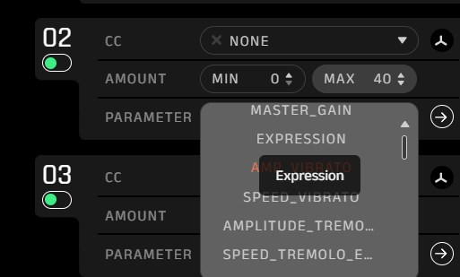「使うCC」を決めて、PARAMETERで動かすパラメーターを指定します。