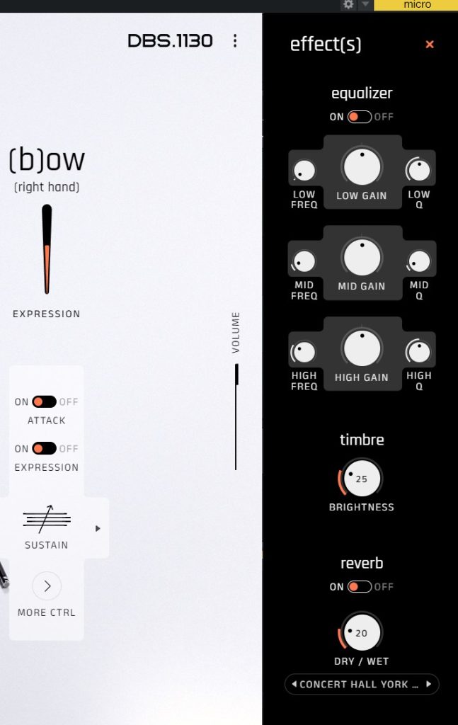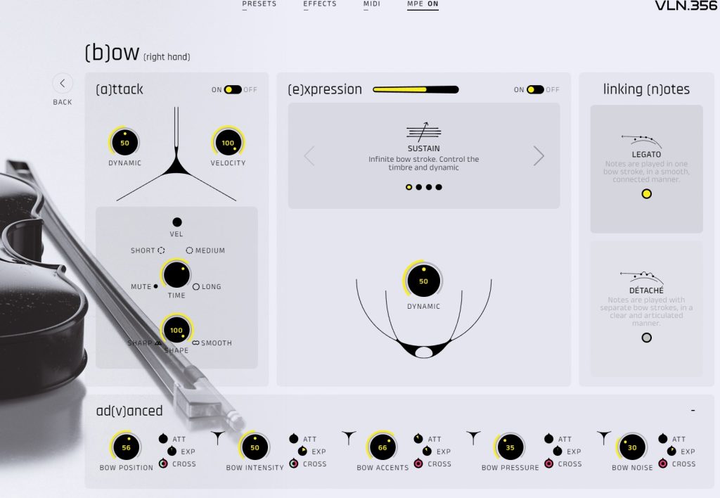 特にAdvancedモードをONにしたときの弓をあてたときのノイズやアクセントの調整ができるのは物理モデル音源ならではの機能で、より表現力をもった音作りが可能になります。