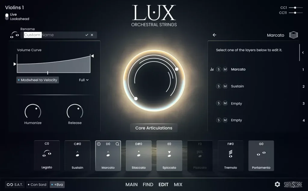 もう一つの魅力は、Morphing Articulations。モッドホイール—キーボードのホイールコントローラー—を回すだけで、スタッカート(短く鋭い音)とスフォルツァンド(急に強く)をブレンドできるんですよ。