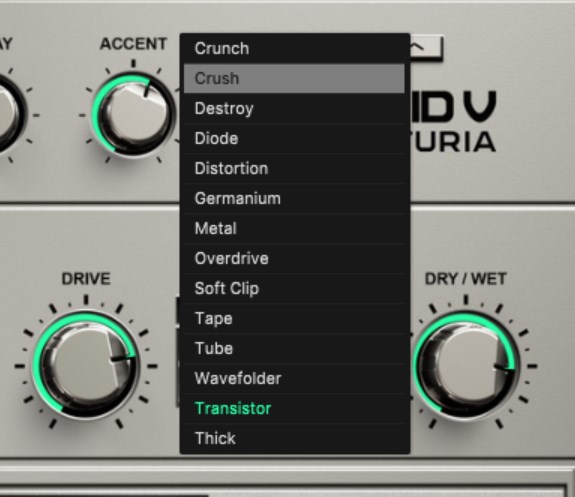 アシッドベースは、歪ませて初めて完成します。 Acid Vには、Arturia FX Collection譲りの超強力なディストーション・モジュールが内蔵されています。