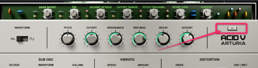 Acid Vのパネルを見てください。 中央部分は実機そっくりですが、その上部や隠しパネルには、見たことのないノブやパッチング機能が並んでいます。 ・2オクターブ下のサブオシレーター ・ビブラート機能 ・高度なモジュレーション これらは実機には存在しません。しかし、アシッドフリークたちが「喉から手が出るほど欲しかった機能」ばかりです。