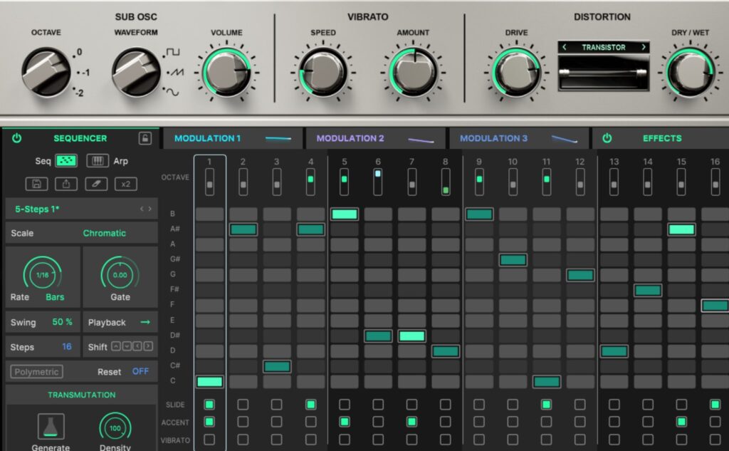 DAWのピアノロールで打ち込むのも良いですが、Acid V内蔵のシーケンサーを使ってみてください。 実機の面倒な打ち込み手順とは違い、マウスでポチポチと音程やスライドを入れるだけの快適仕様です。 さらに、シーケンスの長さを1ステップ単位で変えられるため、「15ステップのループ」など、拍子がずれていくポリリズム的なフレーズも簡単に作れます。