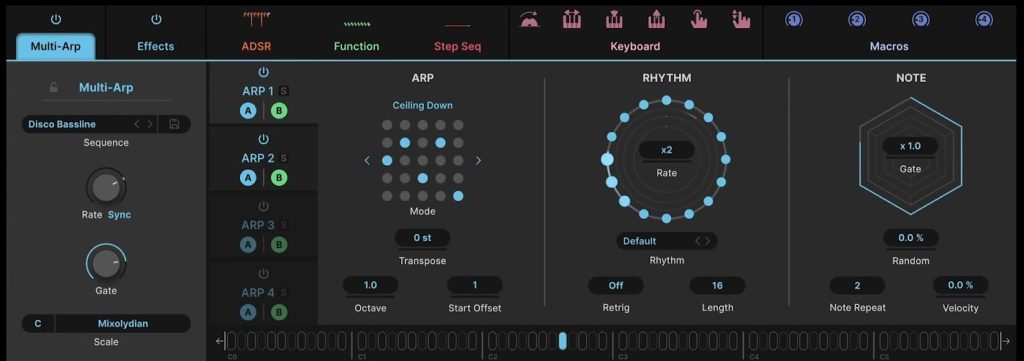 ハードウェアのオリジナルの 4 トラック シーケンサーを革新的に取り入れた Multi-Arp は、直感的な幾何学的デザインと 4 つの積み重ねられたアルペジエーション レイヤーを組み合わせ、数回クリックするだけで洗練されたフラクタル メロディーや複雑なポリリズム サウンドを作成できます。