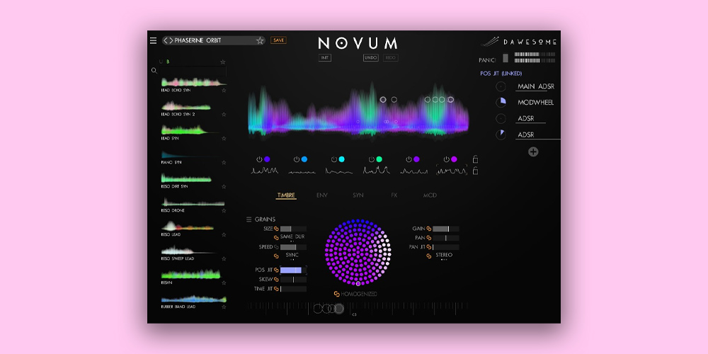 TIMBREセクションではNovum独自のHOMOGENIZE機能により、従来のグラニュラーシンセでは作りにくい、滑らかでベルベットのような質感を実現。