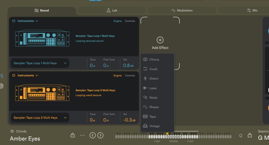 音色の調整も非常にユニークです。 画面中央にある「The Blob」と呼ばれるアメーバのような形をしたマクロコントロールを動かすだけで、複数のパラメーターが同時に変化します。 フィルターの開閉やエフェクトの深さなどが連動して動くため、詳しくシンセのツマミを理解していなくても、直感的に「気持ちいい」音を探せます。 また、コーラスやリバーブなどの空間系エフェクトも搭載されており、Notes一台でかなり作り込んだサウンドメイクまで完結させることが可能です。