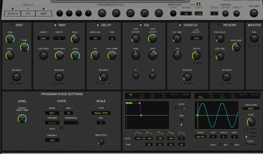 実機は最大同時発音数1音のモノフォニック・シンセサイザーですが、もちろんプラグイン版では和音が鳴らせます。