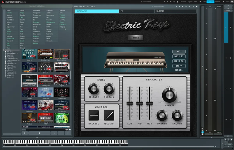 MeldaProduction の Electric Keys は、MSoundFactory プラットフォーム上で動作するバーチャルインストゥルメントです。1970〜80 年代の電気ピアノ音色を忠実に再現することを目的に、4 つの歴史的モデル(MK I, MK II 73, MK II 88, MK V)をサンプリングしています。各サンプルはキーごとのアタック、リリース、ペダル音まで細部まで録音されており、リアルな演奏感を提供します。