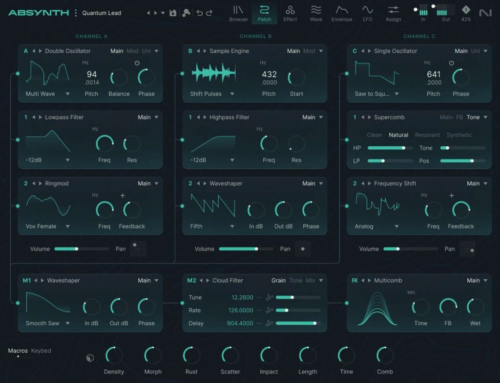 これは、音を空間的に加工して広がりを持たせる機能です。手元にあるメリットとして、ライブパフォーマンスやスタジオワークで差別化を図れます。Native Instruments Absynth 6はMPE(MIDI Polyphonic Expression、鍵盤の各音に個別の表現を加える規格)に対応しているので、表現豊かな演奏が可能です。