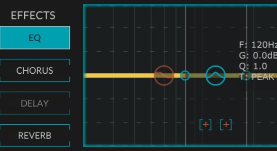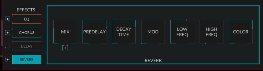 内蔵されている EQ、コーラス、ディレイ、リバーブ、リミッターをオンにするだけで、カオスエンジンが作った剥き出しの音が、一瞬で「レコードから鳴っているかのような」完成されたサウンドへと昇華されます。特にリバーブの密度の高さと、ディレイの音楽的な減衰は、外部プラグインを使わなくても十分に「完結」できるクオリティに達しています。