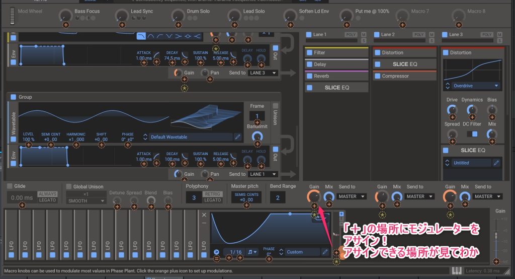 PhasePlantは一画面で完結していてタブを行き来しなくて良いこともあり、見た目がすっきりとどこの箇所でどの音を操作しているかとてもわかりやすいです。