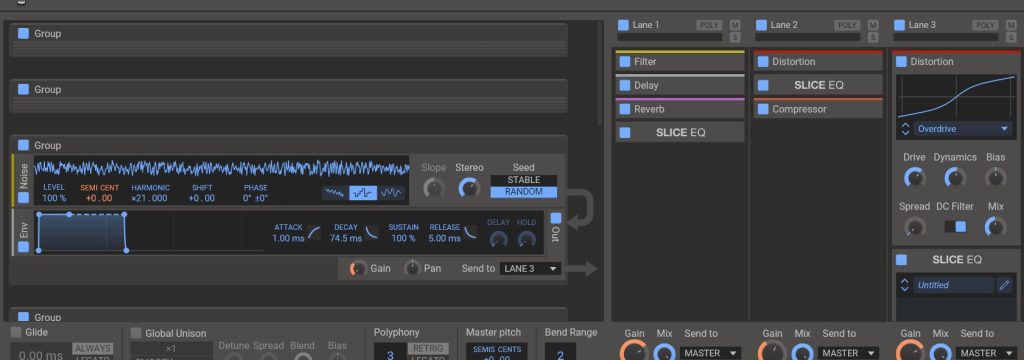 PhasePlantのエフェクトは3レーンあり、レーン内で縦にエフェクトをつなげていく形式です。
