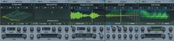 Serum 2の最大のトピックは、オシレーター(発振器)の劇的な進化です。 初代では「2基のウェーブテーブル+サブ+ノイズ」という構成でしたが、Serum 2では「3つのプライマリー・オシレーター」に拡張され、それぞれに以下の5つのモードから好きな方式を割り当てることができるようになりました。