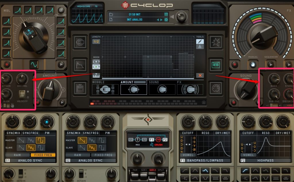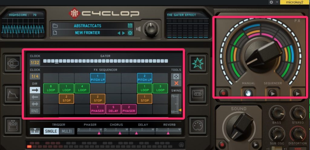 画面上部がSugar Bytes Cyclopsのメイン機能となるWobble KnobとFX Knobです。