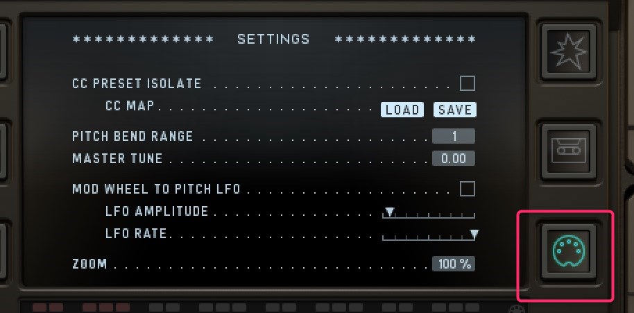 MIDI設定を行うページ。ウィンドウサイズもこのページのZOOMから指定します。