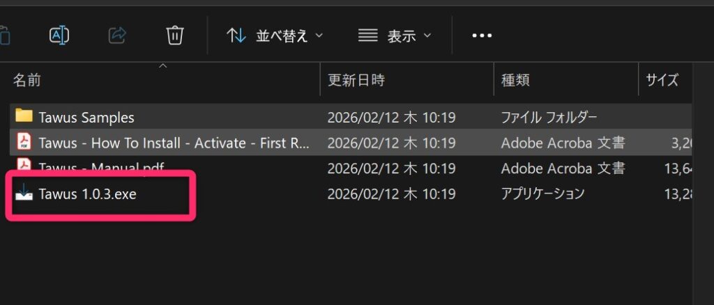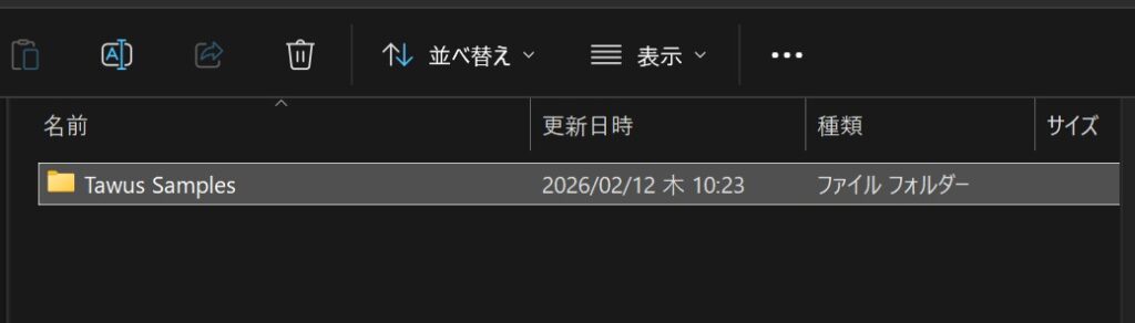 [3] サンプルの場所をDドライブや外部SSDに移動させている場合は、先にインストーラーに同梱されている「Tawus Samples」のフォルダを移動させておきます。