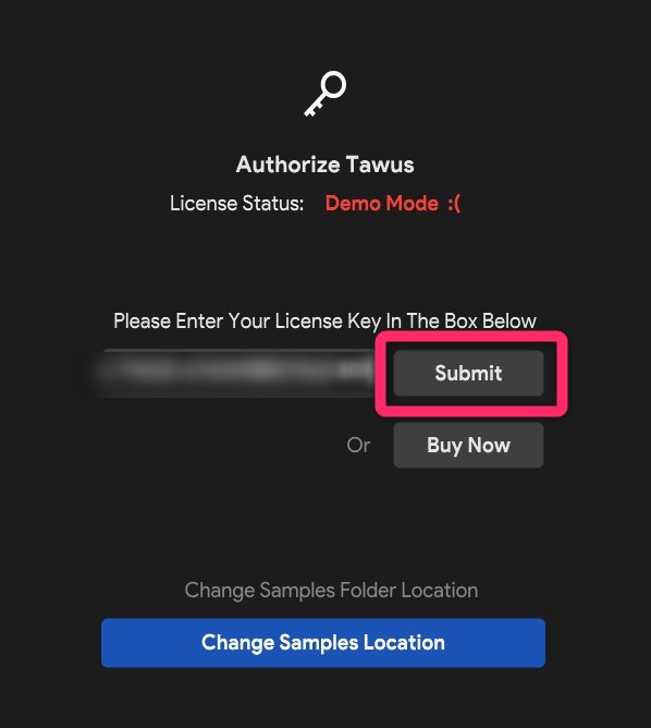 Choose Sample Folderを押して「Tawus Samples」を設置したフォルダを選択します。