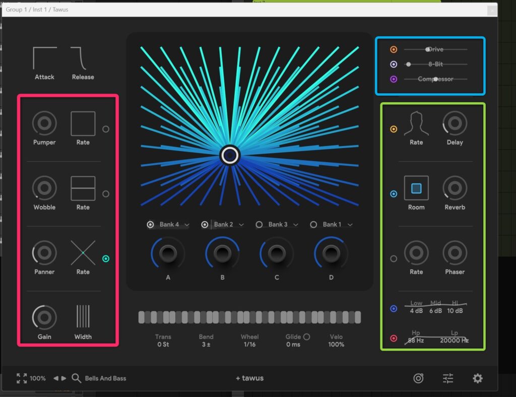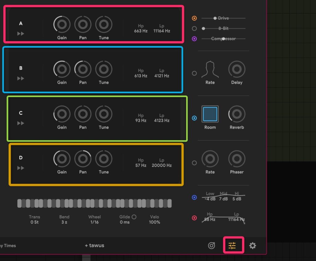 特に、Wobble(ピッチの揺れ)や Pumper(サイドチェーンのようなダッキング効果)は、Lo-Fi Hip Hopなどには欠かせないエフェクトです。 これらをDAW側のプラグインで足すことなく、TAWUS内部だけで完結できるのは、制作スピードを著しく向上させてくれます。