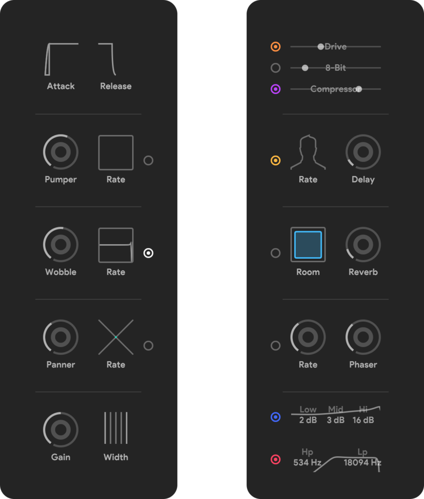 • Bit Crusher, Saturation, Filter, Widener, Vibrato