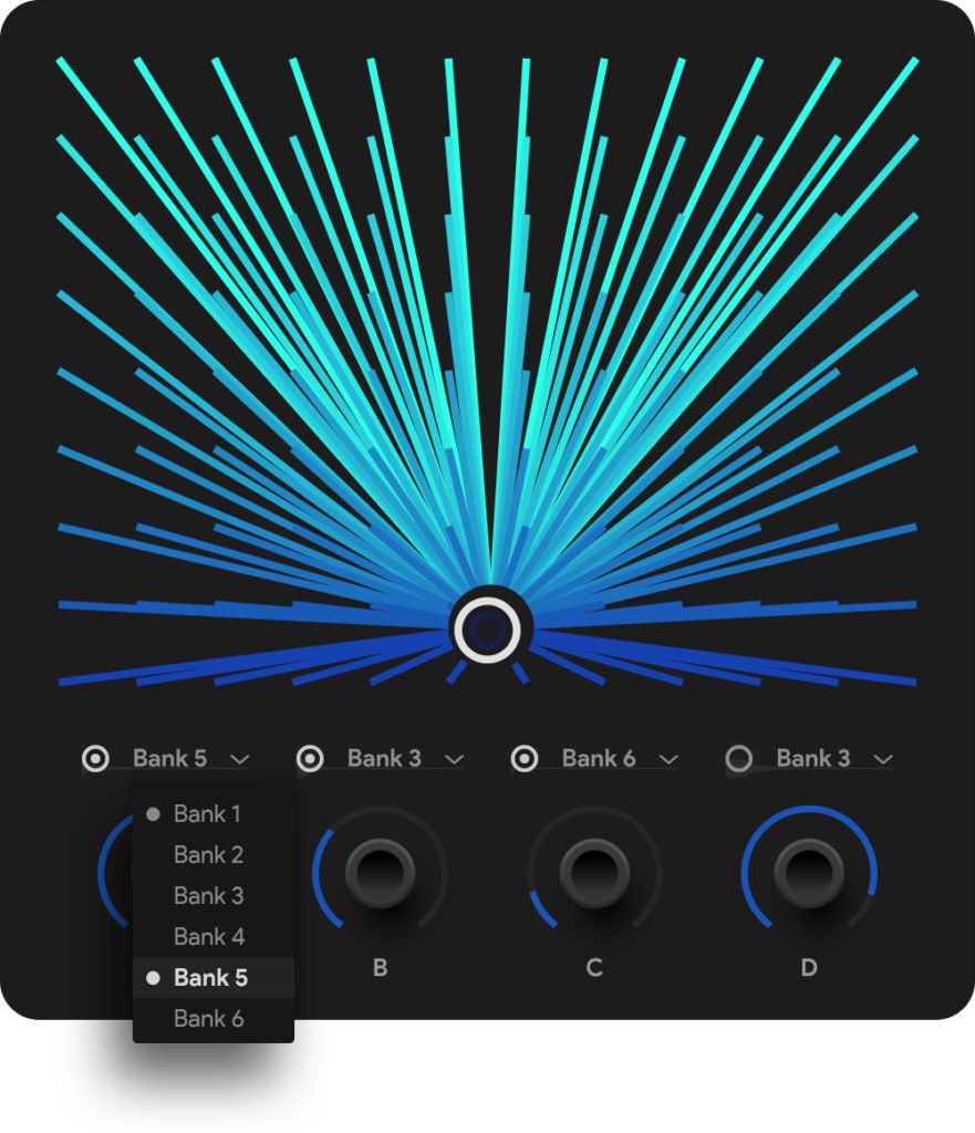 画面の左右に配置されたA, B, C, Dの4つのスロットには、それぞれ独立したサンプラーが割り当てられています。 ユーザーは、6つのバンクに分類された合計600の波形から好きなものを選んでアサインします。 各レイヤーには、ADSR(エンベロープ)、パン、ピッチ、フィルターといった、シンセサイザーとしての基本的なパラメータが完備されています。「レイヤーAのアタックを遅くしてパッドにし、レイヤーBのアタックを早くしてプラックにする」といった音作りも簡単です。