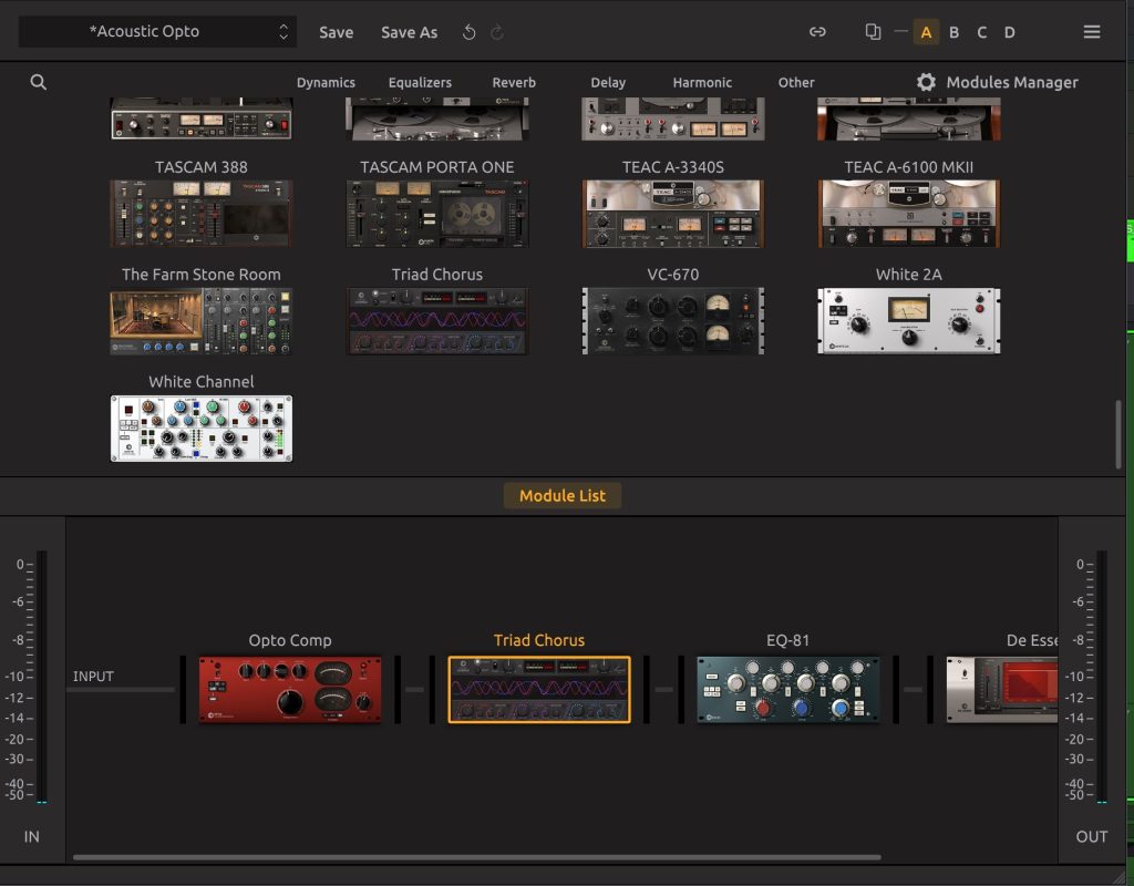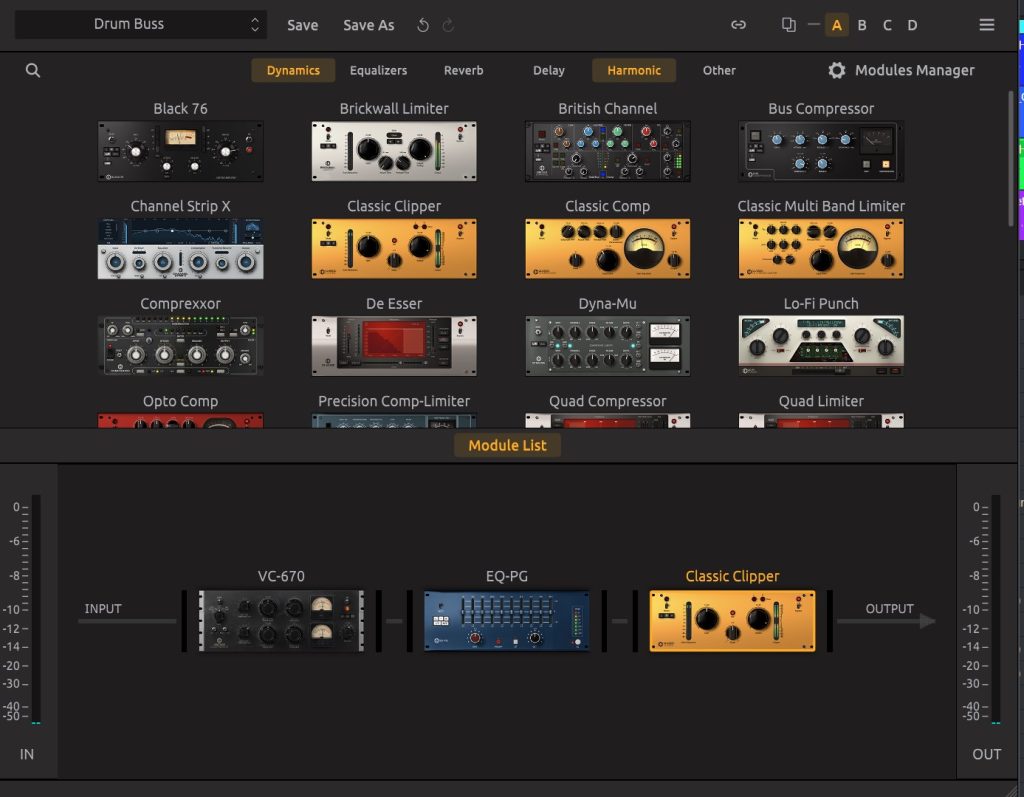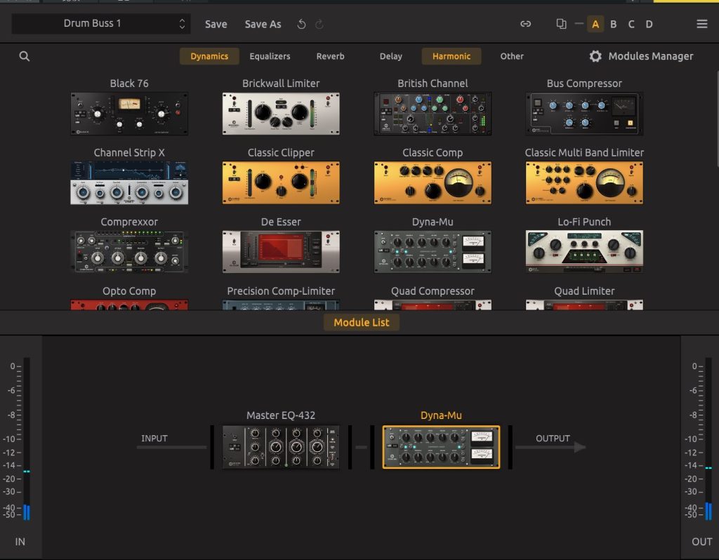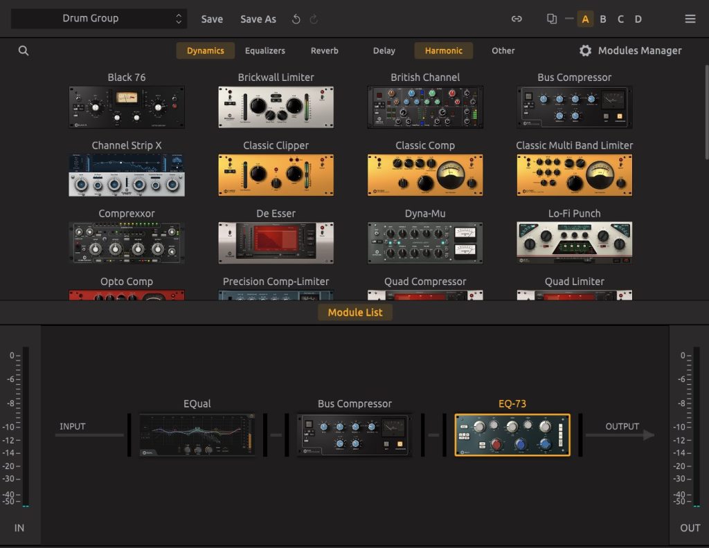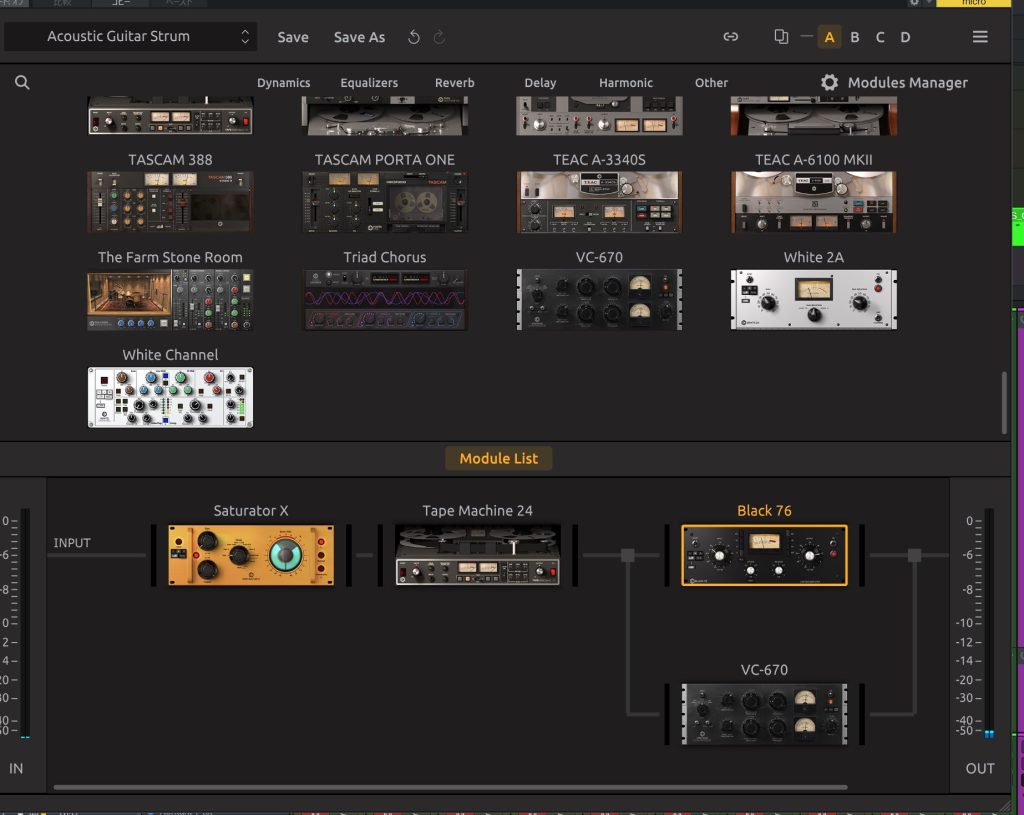 またT-RackSでは「T-RackS」プラグインを呼び出すと、プラグイン内でエフェクトモジュールを組み合わせてエフェクトチェーンを組み上げることができます。