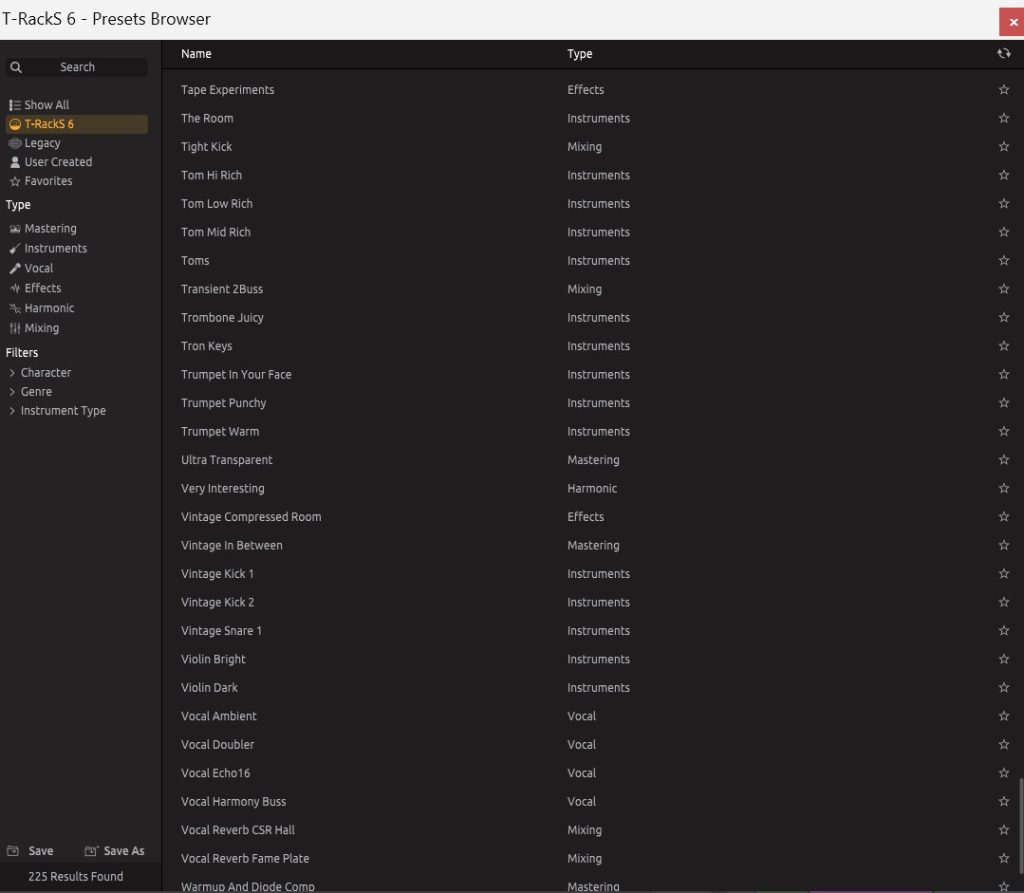 T-RackS 6 の各モジュールのプリセットは少なめなのですが、T-RackS 6 として呼び出すときの組み合わせプリセットは膨大なためチェックしておくと良いです。(225プリセットあります)