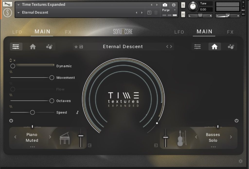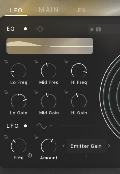 パーティクルのモジュレーションが細かく制御できるのもこの、Sonuscore Time Textures Expandの特性になっていて、MAINタブで動きを制御するほか、LFOのタブで揺れ具合とEQを調整できます。